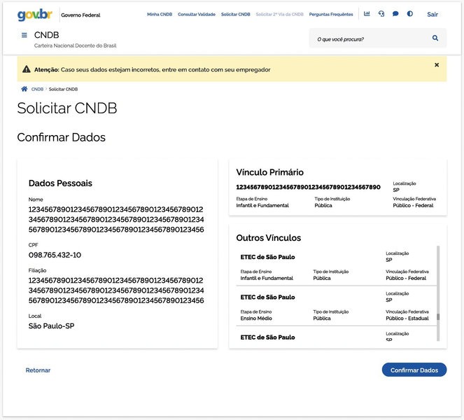 - Verificação dos dados — O sistema exibe automaticamente as informações cadastrais e vínculos institucionais do docente. Caso estejam corretas, basta confirmar; se houver erro, é necessário solicitar atualização junto à instituição de ensino.